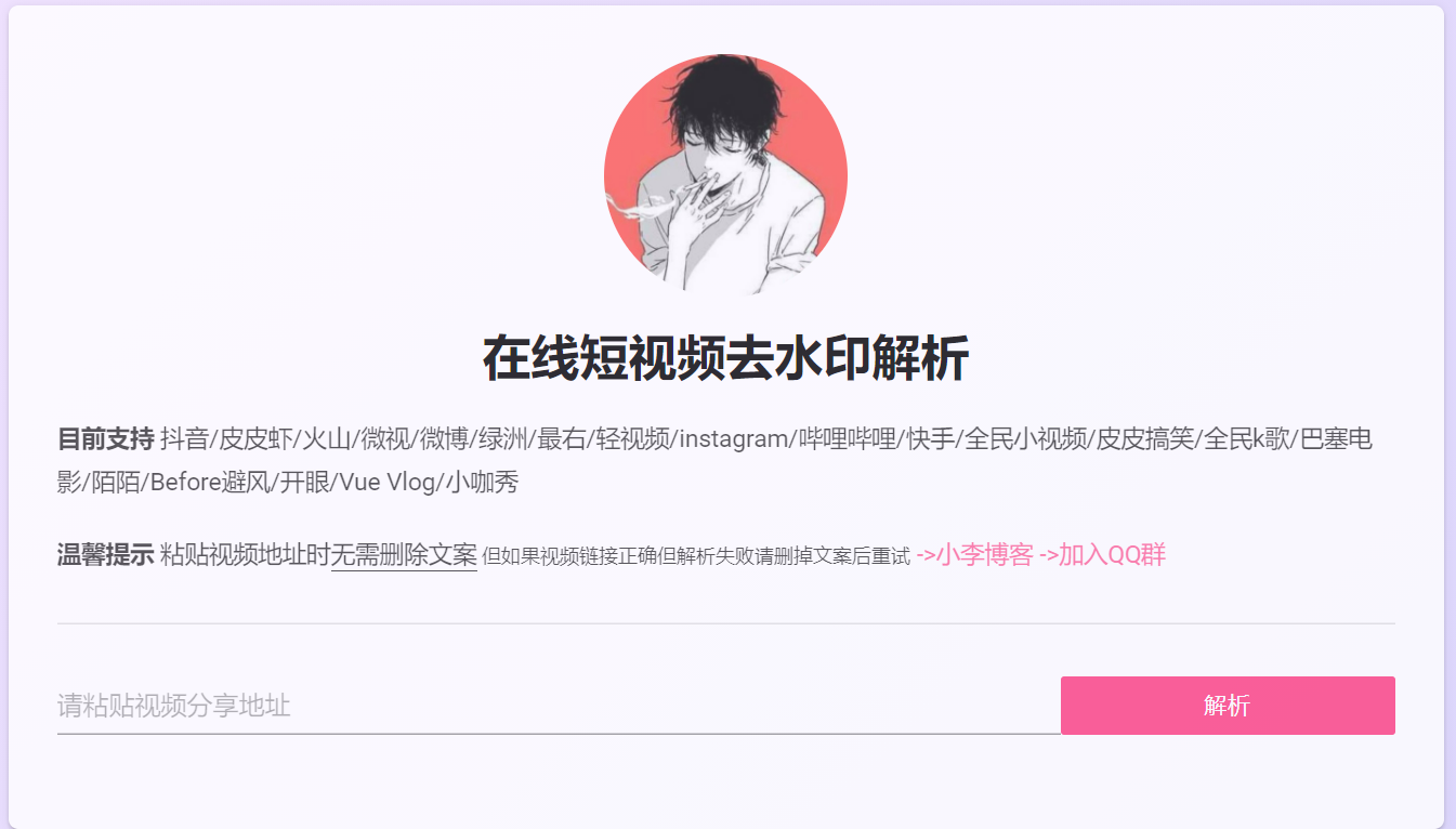 在线短视频去水印解析 2021年3月7日 19:57:13网站评论9041 在线短视频去水印解析 目前支持 抖音/皮皮虾/火山/微视/微博/绿洲/最右/轻视频/instagram/哔哩哔哩/快手/全民小视频/皮皮搞笑/全民k歌/巴塞电影/陌陌/Before避风/开眼/Vue Vlog/小咖秀 温馨提示 粘贴视频地址时无需删除文案 但如果视频链接正确但解析失败请删掉文案后重试\ 网址:api.qq6a.cn 1 登录收藏 /687.html 复制链接 复制链接 我的微信 微信扫一扫 微信小程序 微信扫一扫