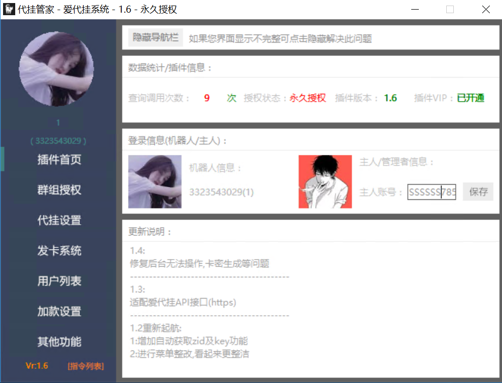 AZG系统查询机器人插件,支持代挂云,用于查询QQ代挂信息和进行代挂QQ功能的开关操作,本插件集成发卡功能,QQ代挂网机器人跨平台和灵活性是代挂网主站以及站长不可或缺的的工具,相对于QQ代挂网APP来说,机器人更加专业!